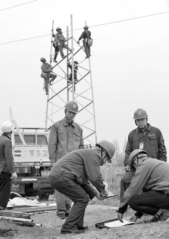 3月23日,随县供电公司检修建设工区电力工人正在架设唐镇至万福店农场35千伏电力铁塔。(记者 李文军 通讯员 万明金 摄)