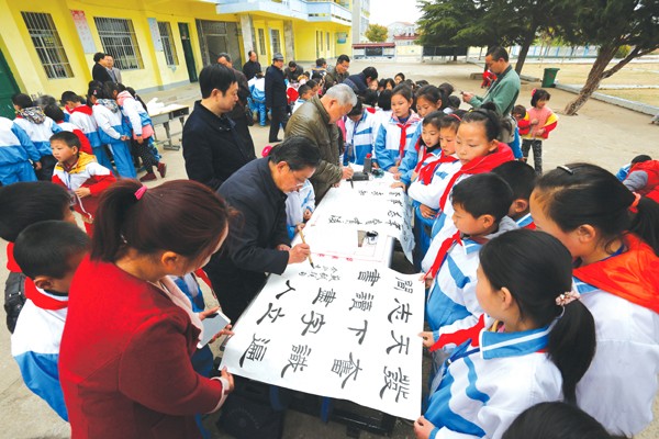 3月29日,随州市老年书法协会为随县唐县镇石佛小学赠送书法用品,并现场指导书法艺术。(记者 徐斌摄)