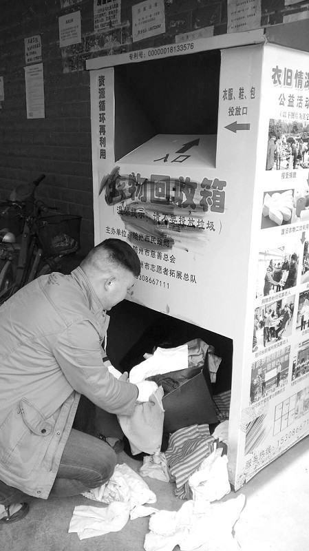 摆放在随城各小区的“绿宝箱“每天可以回收大量市民们送来打包好的干净整洁的衣物,既奉献爱心,环保适用,又有利于再生资源利用。(记者周强摄)