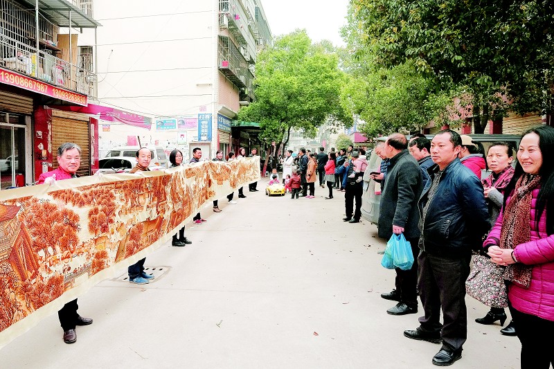 曾都区东城天生街退休女职工刘学琴历时5年绣成巨幅《清明上河图》双面十字绣。该十字绣长18米,宽1米,是根据2010年上海世博会限量发行的张择端所绘的《清明上河图》模版精绣而成。 (记者 李文军摄)