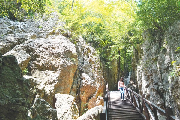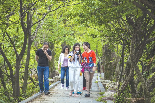 绿林古道因汉代绿林起义军曾在此活动而得名,全长约2千米左右。整条游步道集险、俊、奇、秀于一体,是一处具有原始美、野性美的景点。这里古木参天,老藤攀缘,磬石横卧,流水飞瀑,显得十分幽深,是探秘原始森林、放松心情的好去处。这里,独石成峰,独木成林,峰林交错,任由大自然的鬼斧神工,天地之造化。这里,每一块石,都显示着沧桑,每一棵树,都展示顽强。树茎的坚韧、苍老,已被深深地镂刻在石缝间隙。