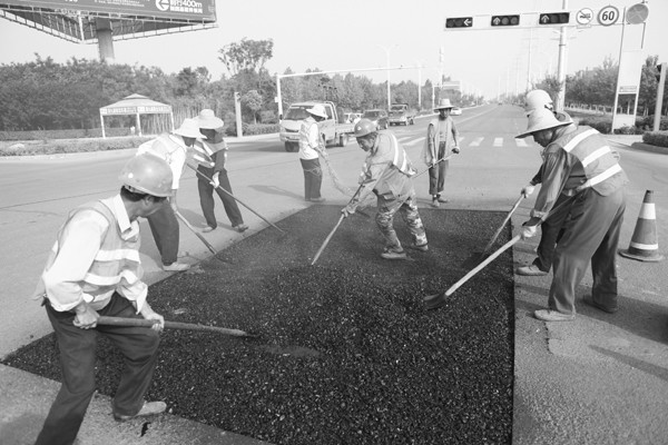 从4月上旬开始,我市对城市破损道路进行维修,保证道路完好。 (本报记者 徐斌 摄)