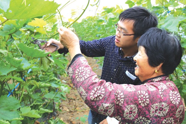曾都区农祖葡萄专业技术协会的600亩葡萄长势喜人。图为技术员曾威(左)手把手教葡农剪枝。(通讯员 刘毓 多思摄)