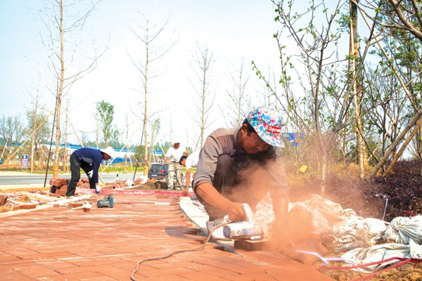 5月11日,工人正加紧铺设新316国道城区示范段人行绿道,其余绿化工程也在紧张有序建设中,争取寻根节前完成。 (本报记者 王璟天 摄)