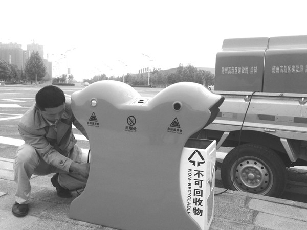 随州高新区管委会高度重视创卫工作,今年投资24万元购买转送箱75个、果皮箱87个、垃圾桶1072个,投放到各社区和主次干道。图为施工人员正安装果皮箱。(记者 孙洪涛 通讯员 黄勤书摄)