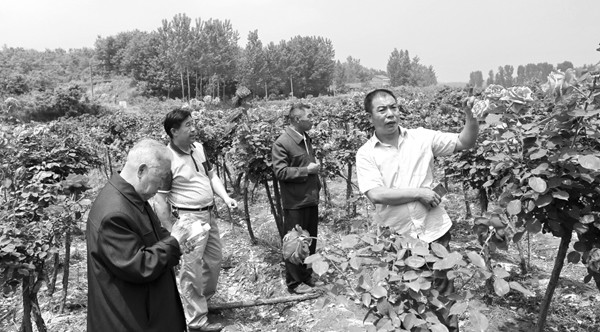 随县万和镇尖峰村村民杨海国 (右)利用当地野蔷薇树蔸同月季花嫁接成树桩月季,为我市园林绿化提供了新品种。(本报记者 孙洪涛 摄)