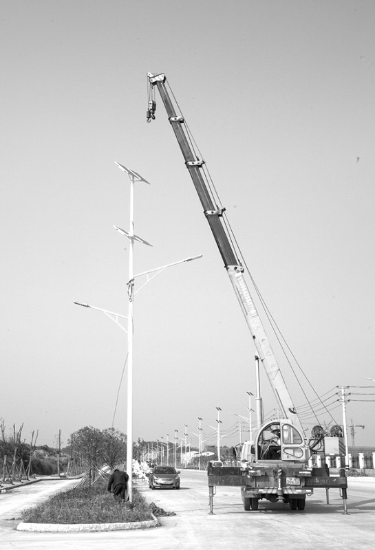 5月12日,随城青年东路上,施工人员正在安装新型太阳能路灯,提升青年东路夜间的交通安全和景观效果。 (本报记者 王璟天 摄)