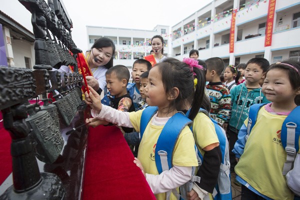 5月23日,随州博物馆“文化服务进校园”活动走进随县洪山镇朱集小学,让孩子们了解家乡的历史文化。图为孩子们在敲击编钟复制品。 (本报记者 徐斌 摄)