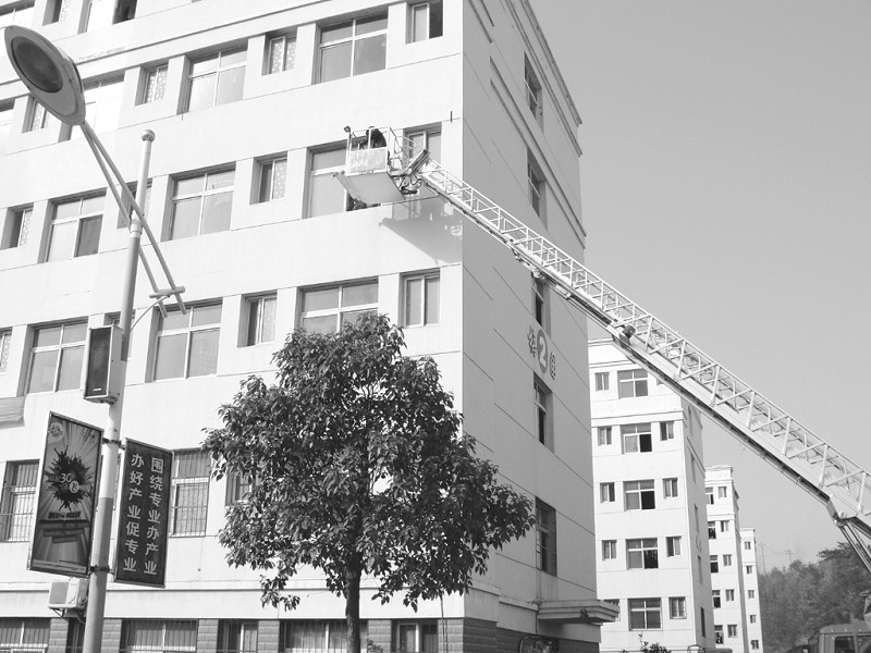 日前,为提高学院师生减灾应急能力,随州职业技术学院开展了应急避震、灭火展示、高空云梯救援等科目的演练。图为高空云梯现场救援演练的情景。(通讯员 张亦飞摄)