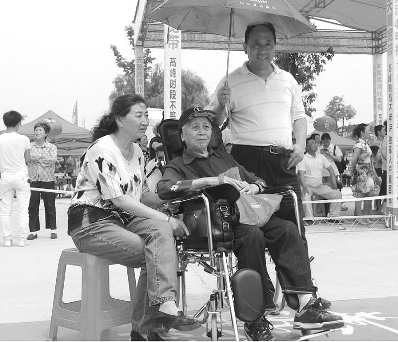 5月31日,在丙申年炎帝文化庙会现场,一位来自武汉的80多岁的老人在家人陪同下,坐在轮椅上观看精彩的演出,圆了她的“寻根梦”。(本报记者 周强 通讯员 方明华摄)