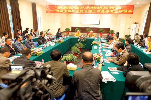 与会专家学者在围绕中国佛教造像艺术的传统与传承及本焕长老等身造像、昆仑玉材质及雕塑手法等多方面进行了深入地探讨。专家一致认为,我国佛教造像多为石雕,而玉雕艺术虽然源远流长,但多为饰物、摆件等小型作品,大型的等身人物玉雕并不多见。本焕长老是中国佛教继往开来的一座丰碑,也是中国佛教文化的重要楷模,在国内外都有着崇高的声誉。为本老造像,不仅可以纪念前贤,更可以垂范后世,传播本老“不为自己求安乐,但愿众生得离苦”的佛菩萨精神,引导信众爱国爱教,促进社会和谐,庄严国土,利乐有情。