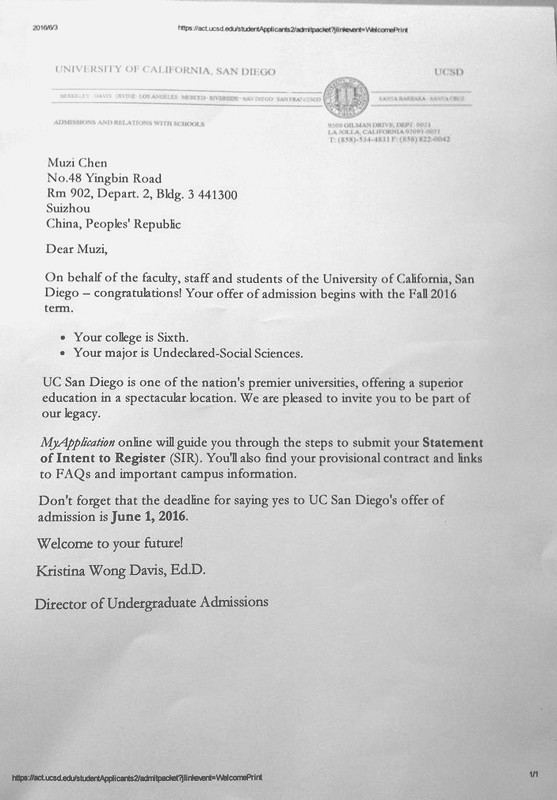 随州二中(随州市外国语高级中学)陈牧梓同学考取美国加州大学圣地亚哥分校 (University of California San Diego,简称UCSD),该校是美国的一所著名公立大学,世界大学排名第19位。(清华大学世界大学排名第59位)陈牧梓同学录取通知书