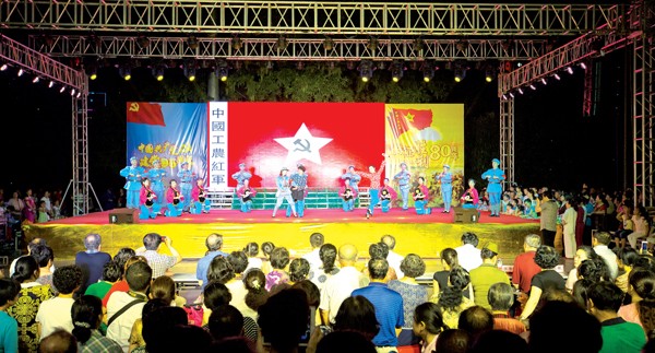 6月29日晚,随州市离退休老同志纪念中国共产党成立95周年暨红军长征胜利80周年文艺演出在神农公园举行,市领导王志勇、夏洪国、罗国银与市民一起观看了演出。 (本报记者 徐斌 摄)