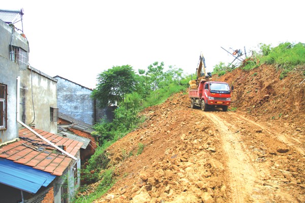 7月5日,曾都区府河镇白河滩村卫生室房屋背后山体出现裂缝,该镇组织工程机械除险救灾,避免山体滑坡造成群众生命财产损失。(本报记者 王璟天摄)