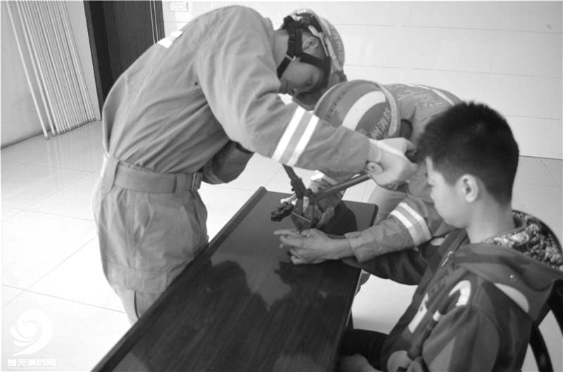 铁环“咬住”男孩手,消防人员巧拆取