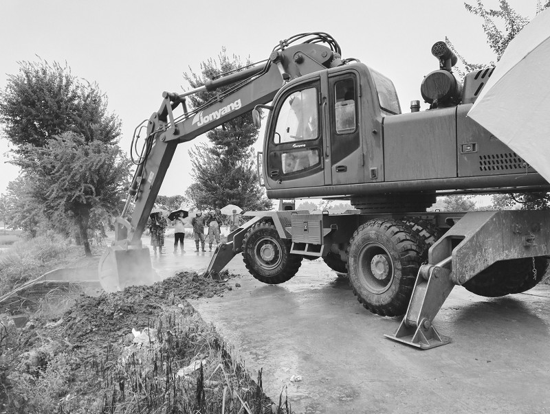 预备役工兵团组织机械在随州高新区淅河镇费屯村挖渠排洪。(记者 徐斌 摄)