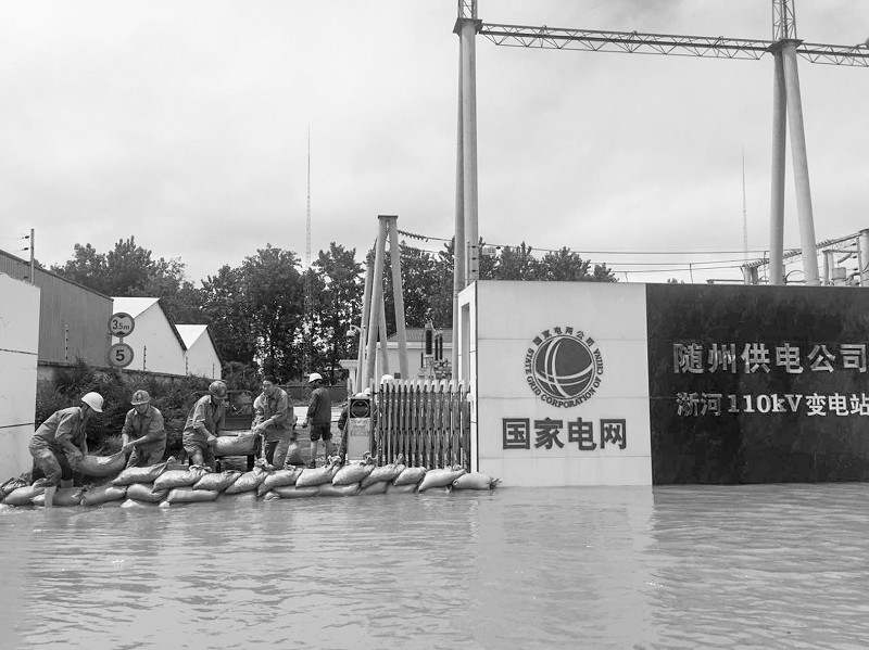 7月20日,国网随州供电公司员工齐心协力帮助随州高新区淅河变电站紧急垒起沙包墙抵挡洪水侵袭。 (本报记者 李文军 通讯员 龚昕 夏一菲 摄)