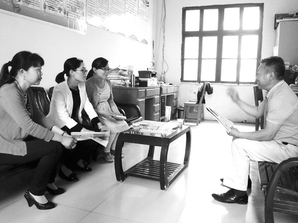 随县环潭镇河武小学十分注重对青年教师的培养,做到政治上关心,工作上支持,生活上照顾,调动了青年教师在乡小教书育人的积极性,工作上总是充满着活力。图为该校校长正在与三位青年教师探讨教学业务。(通讯员 梁红玲 姚莉萍摄)