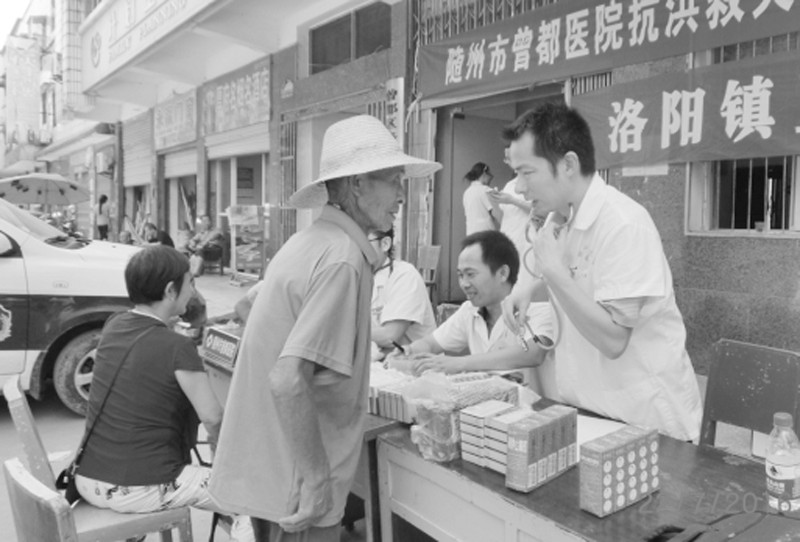 7月22日,曾都医院派出抗洪救灾医疗队到洛阳镇进行巡诊,送医疗、送药品,发放健康宣传材料,以救灾防病实际行动践行“两学一做”。 (通讯员 陈高 李文明 摄)