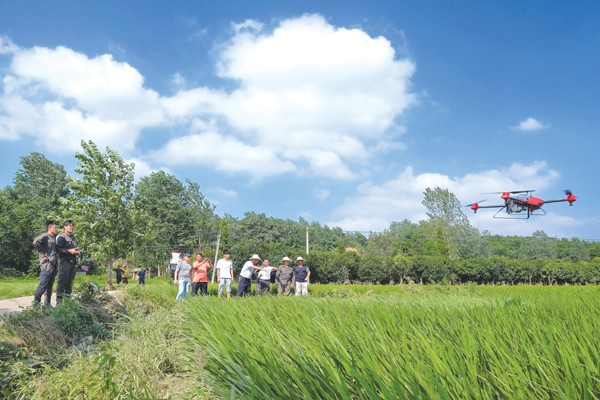 7月22日,曾都区植保站特邀湖北长投农机装备技术有限公司无人机植保服务队来到遭受严重洪灾的何店镇辽原村4组,用无人机免费为500亩稻田喷洒农药,预防二代二化螟和三代稻飞虱等病虫害的发生。 (记者 李文军摄)