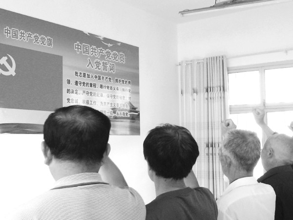 近日,随县三里岗镇中心学校开展“主题党日+”活动,该校全体党员面对党旗,庄严举起右手,重温入党誓词,表示积极为党工作,为教书育人多作贡献。 (通讯员 马晓波摄)
