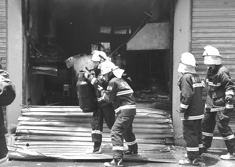 ◆7月29日,随州城区沿河大道一烧烤店突发大火,将店铺卷闸门烧裂并有向临近商铺蔓延之势,消防部门接警后火速赶往现场利用高压水枪将火势扑灭,并将店内遗留的液化气罐移除。 (本报记者 王瞡天 摄)