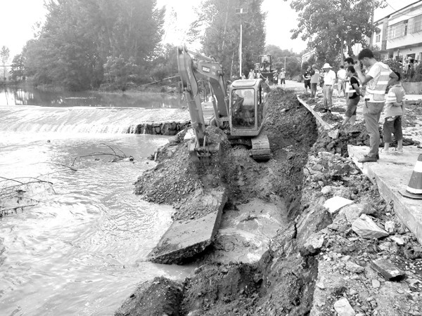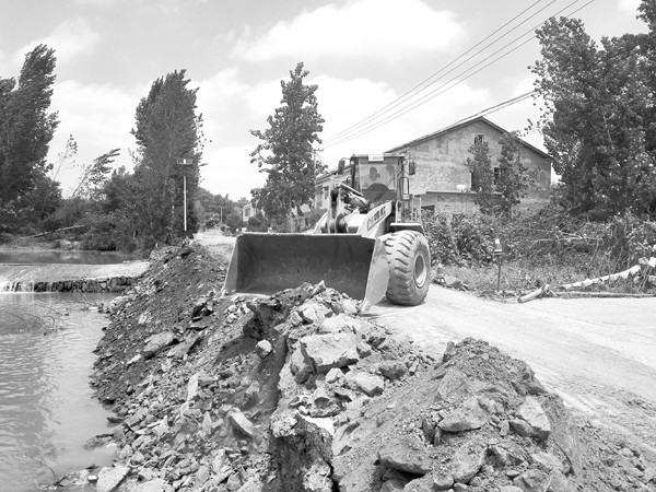 降雨过后,随州迎来高温,室外温度达到了35摄氏度以上。7月22日,市交通运输局曾都分局在九口堰村段的路面洪水还未消退的情形下,调来一台挖掘机和一台推土机,准备对长张线王家河桥断的桥面进行扶正搁稳,再填充土石方,形成简易便道,恢复道路畅通。