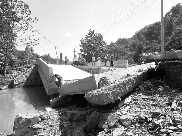 记者看到,10多名公路人戴着草帽,顶着烈日,对桥梁进行处理,汗水已湿透了他们的衣衫。经过近两个小时的奋战,一条简易道路贯通,车辆可通行。来不及休息,他们又奔赴下一个水毁道路现场。