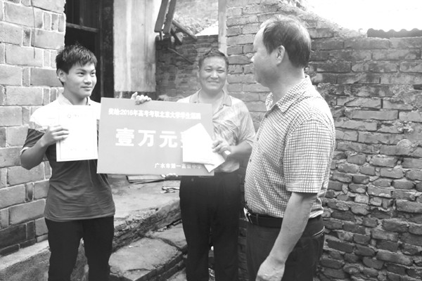 ← 带着对优秀学生的祝贺,对贫困学子的关爱,8月2日,广水市教育局、广水一中等相关负责人一行,走访了部分优秀贫困高考生,并为他们送去助学金,鼓励学子们克服困难,坚定信念,学好本领,立志成才。图为在广水市郝店镇严家湾村,慰问组一行看望优秀高中毕业生湛鹏,今年高考中他以684分的优异成绩考取北京大学。