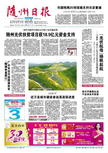 本报讯 记者刘诗诗报道:8月18日,我市与国家开发银行湖北分行签订开发性金融支持光伏扶贫合作备忘录,国开行将对随州325兆瓦分布式光伏扶贫项目给予18.9亿元资金支持。这是国开行首单项目