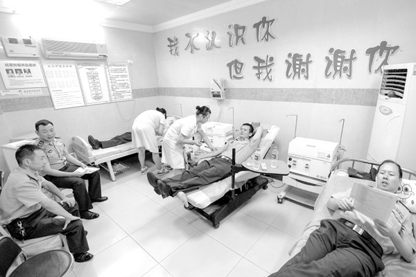 为了缓解血液库存不足的压力,近日随州陆军预备役工兵团组织官兵参加义务献血,用一袋袋带着体温的鲜血诠释了官兵“视人民为父母,把驻地当故乡”的情怀。(本报记者 李文军摄)