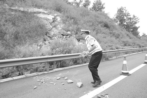 ▲ 高速交警清理滑坡石块