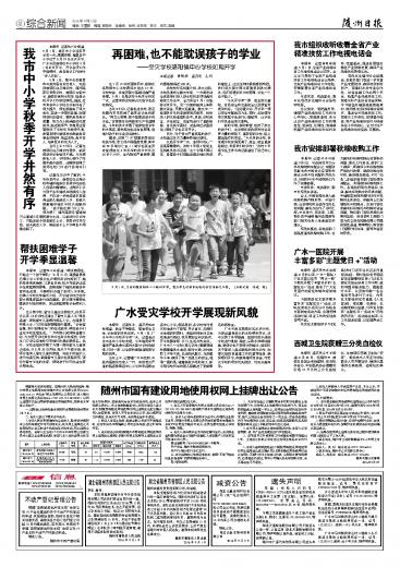 本报讯 记者陈巧玲报道:9月1日,城区中小学迎来开学第一天。根据安排,随县各中小学已于8月29日正式开学,广水市及曾都区中小学校9月1日正式开学,开学各项工作平稳顺利,教育教学工作按时“