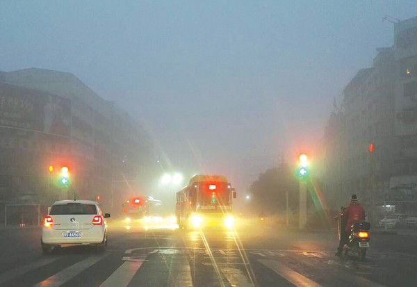 12月1日上午,曾都区、随县出现了能见度小于500米、局部小于200米的雾。道路上,各类车辆打开雾灯,减速慢行。(本报记者 徐 斌摄)