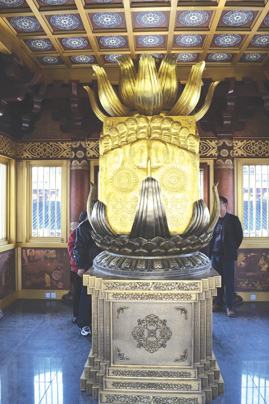 穿过供奉药师佛的法堂,我们来到了佛足阁。阁内供奉的是大洪山的开山祖师慈忍大师的一对佛足,因为战乱,这对佛足失传,今天我们用黄铜铸造了一对佛足供奉于此,还原慈忍祖师斫足代牲祈雨的历史。同时特别邀请中国作家协会委员、湖北省作家协会副会长刘醒龙先生撰写楹联一副:慈无足长传无量佛,恩有道普渡有缘人。俗语“临时抱佛脚”,抱抱佛脚,也是希望将慈恩报恩,恩泽天下的精神继承和发扬光大,报国家恩,报众生恩,报父母恩。