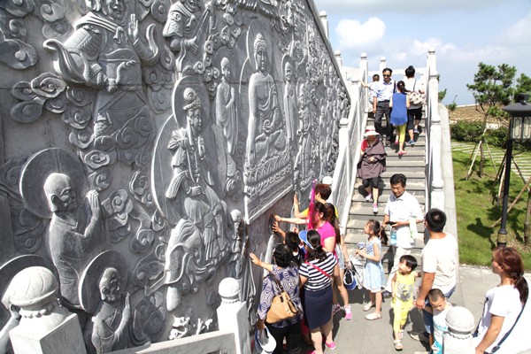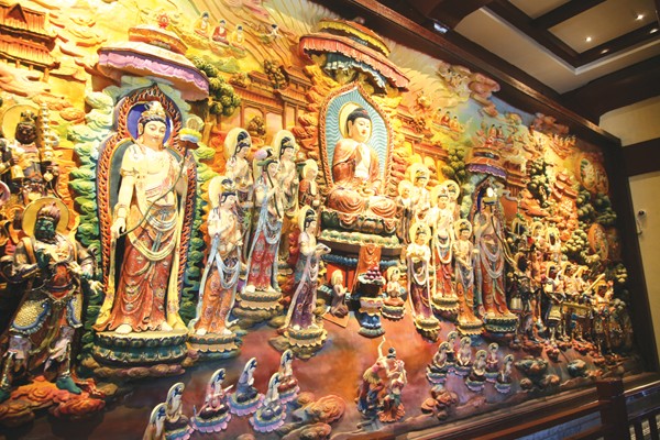进入庙门,首先映入眼帘的是9.3米高的二王尊——哼哈二将,他们镇释山门,保卫佛国、佛寺和佛法永不受侵害。大慈恩寺庙门里独树一帜的地方就是观音三十三化身图,它高24米,宽10米,采用生漆脱胎工艺,艺术精湛,美仑美奂,举世无双。