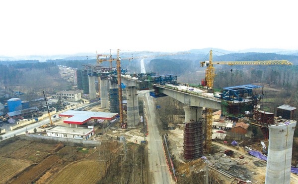 汉十高铁随州段建设加速推进,目前已开始箱梁架设。 (本报记者 徐斌 通讯员 刘安国 摄)