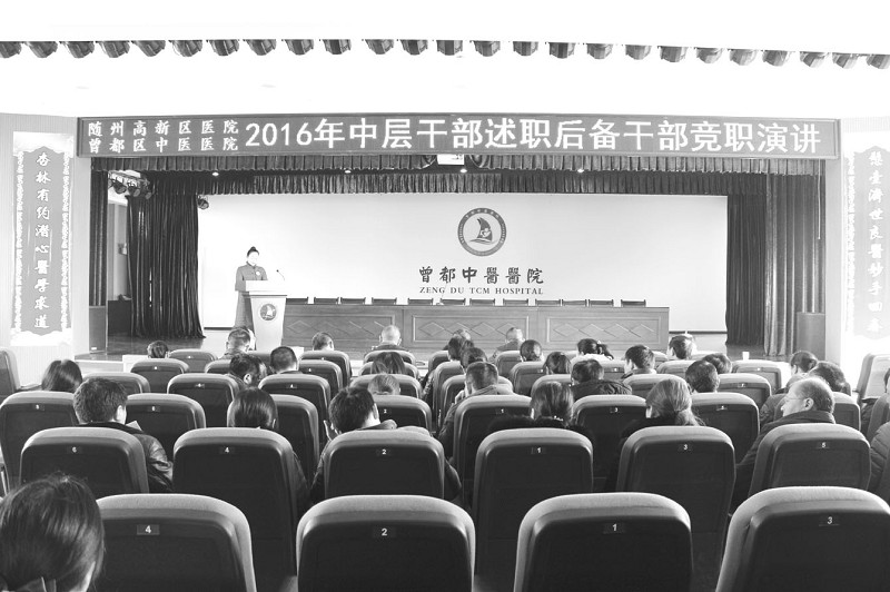 2016年12月29日,随州高新区医院组织全院中层干部27人开展了述职述廉演讲以及7名后备干部的竞聘演讲活动,全体领导、职工参会,评委为院领导班子成员和职工代表共计9人,各位演讲者都经过了精心准备,充分展示了各自特色。 (通讯员 付 莹摄)