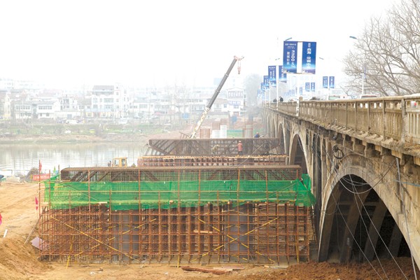 1月12日,涢水一桥扩建工程正在加紧施工中,预计2018年建成通车,届时将进一步改善和提升随州城区交通路网通行能力。 (本报记者 王王景天 摄)