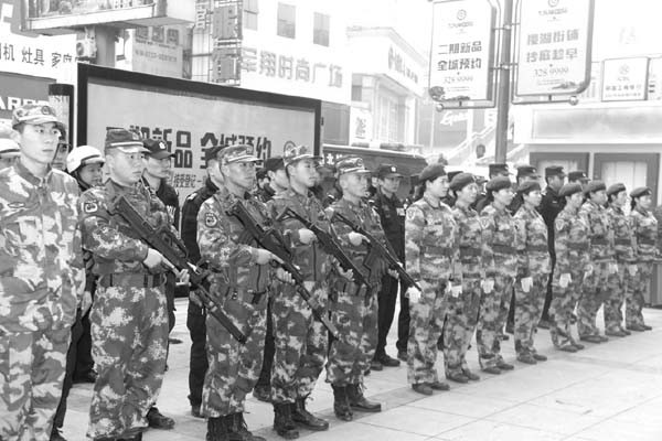 为确保岁末年初社会治安平稳,随州市公安局结合治安实际,创新警务模式,在深化“七警合一”基础上,着力推进公安武警混编联勤、警企联防、警民志愿者联巡工作,密织立体化防控的“天罗地网”。图为随州市公安局集结特警、武警、交警、治安警、铁路警、视频巡查警、协警及企业女民兵,打响春节治安保卫战。(通讯员 程昆 刘智明摄)