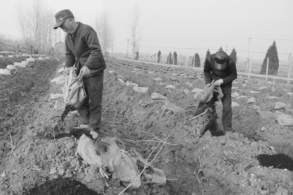 近日,市老促会帮扶的曾都区万店镇龙头湾村3组蓝莓产业园里,村民们为树窝下肥。(通讯员 石守京摄)