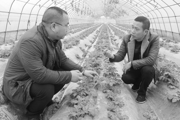 曾都区何店镇花都农业有限公司利用35亩大棚,种植无污染地膜土豆。图为该公司总经理卢仁军(右一)邀请区科协、大海菌业有限公司科技人员,就适应大棚种植地膜土豆的温度、湿度、病虫害防治、采收时机、销售、加工、储存等,进行技术指导。(通讯员 多 思摄)