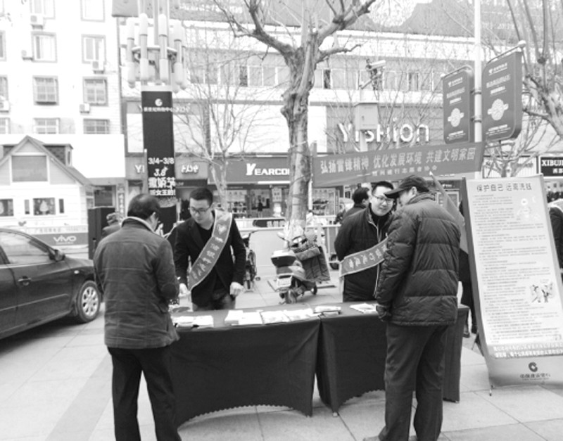近日,邮储银行随州市分行团委积极响应市金融志愿服务总队号召,组织青年团员开展以“心手相牵 金融同行”为主题的学雷锋志愿服务活动,走上街头向市民宣传金融利民政策,现场解答金融安全知识。(通讯员 郭漫漫 张金玲摄)