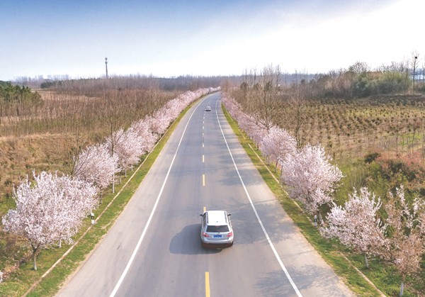 经过多年精心打造,炎帝大道景观带效果初显,图为炎帝大道两旁迎春绽放的红叶李。 (本报记者 徐斌摄)