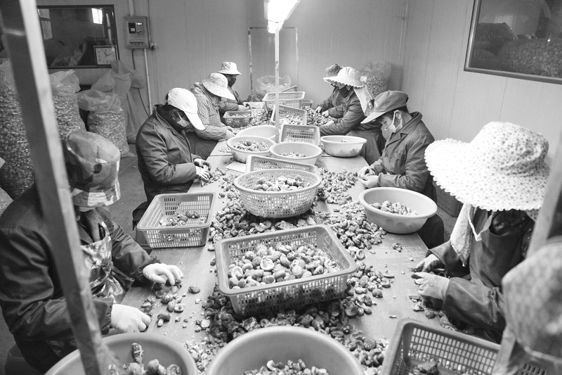 随县草店镇积极引导香菇产业转型升级,产品外销新加坡、马来西亚等国。图为工人进行香菇剪茎作业。