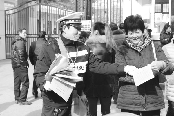 连日来,广水市公安局积极开展“护学行动”。图为广水市第二届道德模范乔长富在北小门前向群众宣讲散发宣传资料。 (通讯员 王贵生 摄)