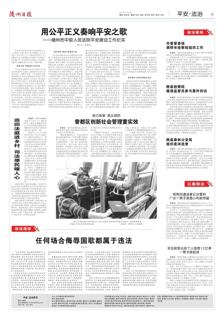 通讯员 李海波 近年来,随州市中级人民法院坚持“公正与效率”主题,贯彻“为大局服务,为人民司法”工作方针,大力开展各项审判工作,积极参与社会管理综合治理和“平安随州”的创建工作,切实维