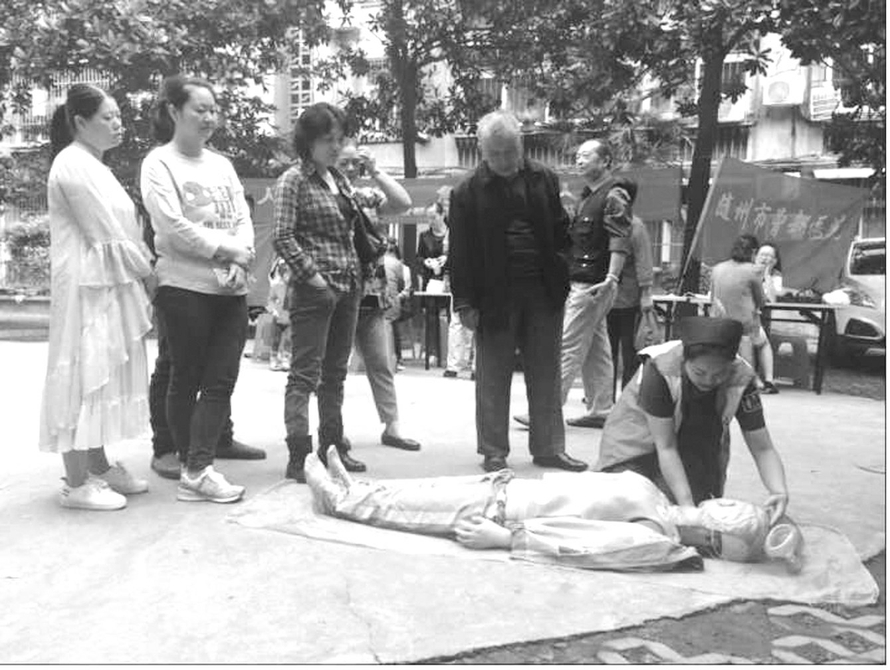 ▲2017年9月9日是第十八个“世界急救日”,曾都区红十字会、曾都医院、解放路社区卫生服务中心三方联合进社区,以“人人学急救、急救为人人”为主题,普及急救知识和技能,提高群众自救互救能力。图为医务人员指导居民进行“心肺复苏”。(通讯员 曾言孔艳梅摄)