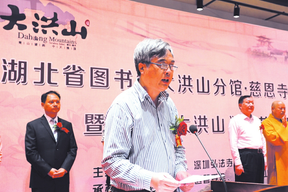 湖北省图书馆党委书记贺定安:图书馆是人类思想的宝库,也是一个地方文明程度的重要标志。大洪山历史文化厚重,尤以佛教文化源远流长。此次在大洪山核心景区建设省图书馆分馆,并与大洪山慈恩寺禅修书院建设相融一体,是省图书馆打造特色服务品牌,传播优秀传统文化的具体行动,是大家共同探索建设佛教特色图书馆、实践公共文化服务新模式的一项创新举措,体现了省图书馆、大洪山景区和慈恩寺三方合作、包容、共享、开放的有益探索,对提升景区文化品位、传播大洪山佛学文化、促进文化旅游发展必将起到重要作用。希望图书馆不负众望,以打造省内知名、国内一流的禅修特色图书馆为目标,充分发挥图书馆的知识作用和佛学的教化作用,不断丰富馆藏资源,提高服务水平,为促进景区经济社会文化大繁荣作出更大的贡献!