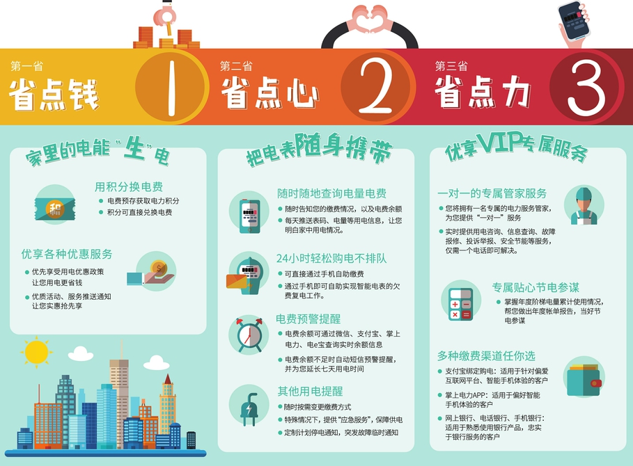 更智能化的充值方式:可通过电e宝、掌上电力、支付宝、微信等更多样化的互联网方式完成电费充值。更可签约代扣协议,免去因忘记预存电费造成意外停电。